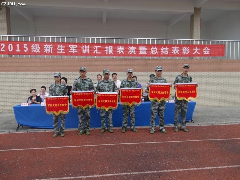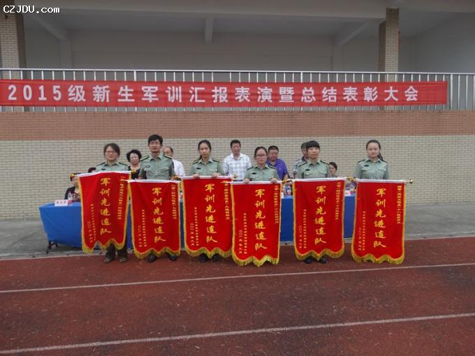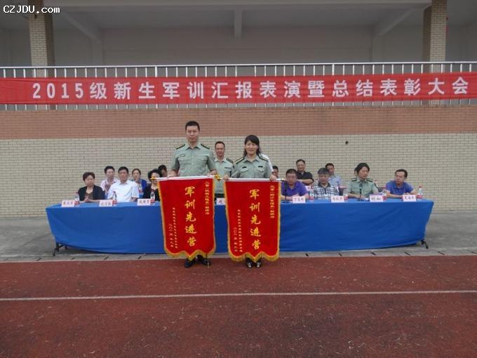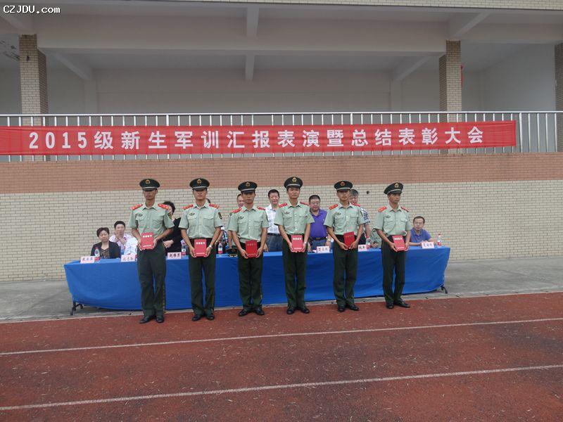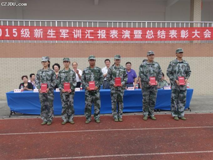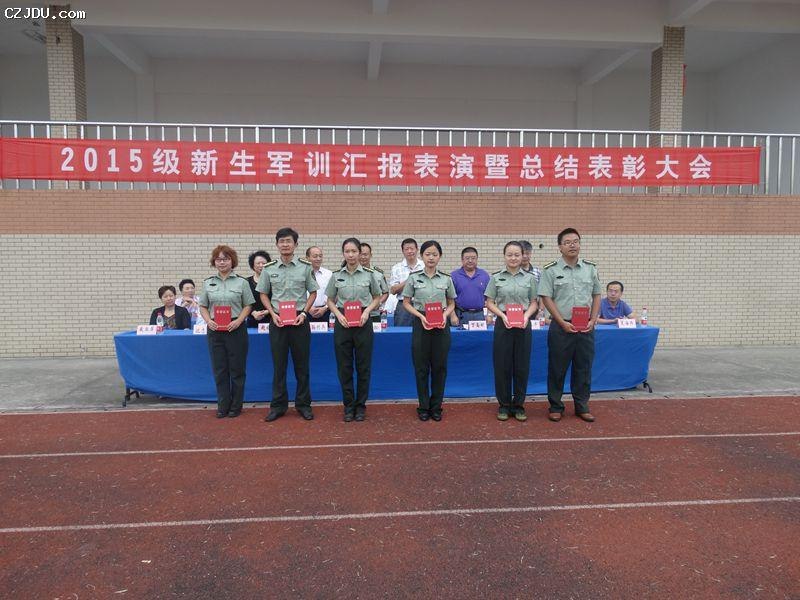 表彰大會在雄壯的國歌聲中正式開始。隨著分列式進行曲的響起,各方陣踏著矯健的步伐,整齊劃一地邁過主席臺,接受學院領導和承訓部隊首長的檢閱。表演方隊隨后進行了精彩的軍體拳表演。表演結束后,孫利兵副院長宣讀了我院《關于表彰2015級新生軍訓先進集體及個人的決定》。2個先進營、6個先進連隊、68個衛(wèi)生文明宿舍、6名優(yōu)秀教官、6名優(yōu)秀指導員、50名軍訓優(yōu)秀學員受到了表彰。在歡快的樂曲聲中,主席臺前排領導為軍訓先進集體和優(yōu)秀個人頒獎并合影留念。院長王榮成、黨委書記丁高明向部隊授予了錦旗。