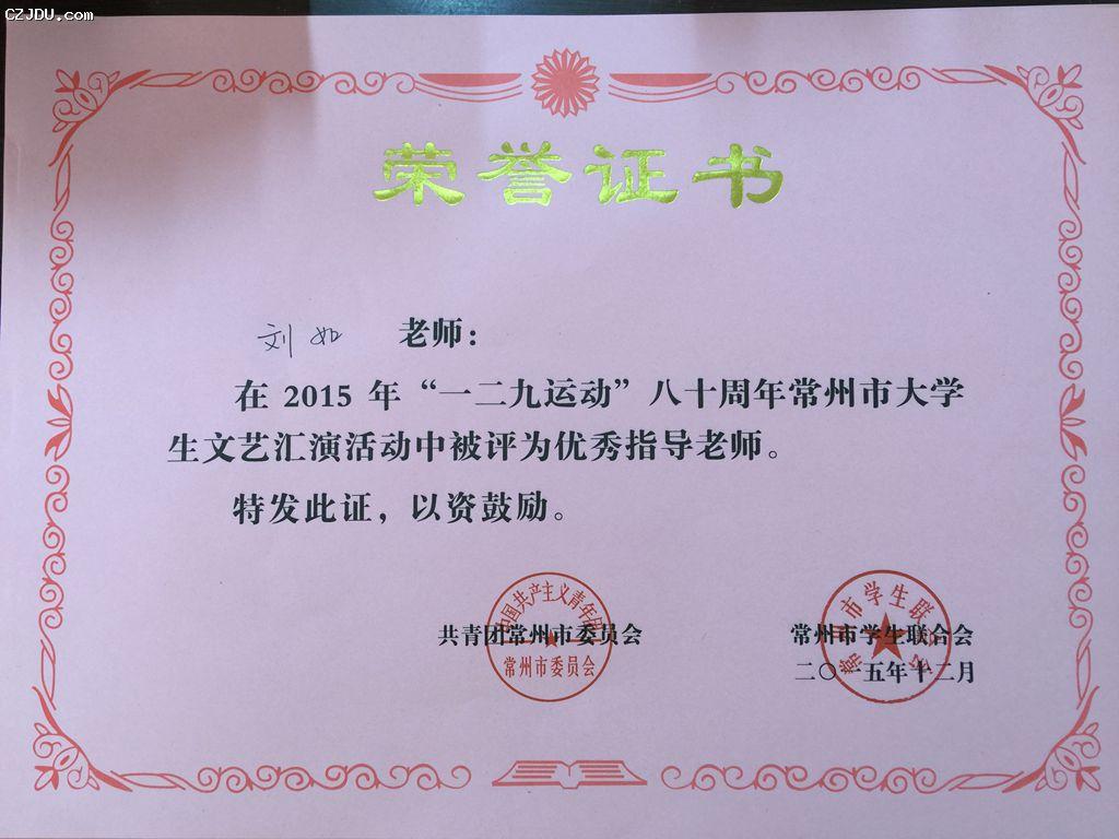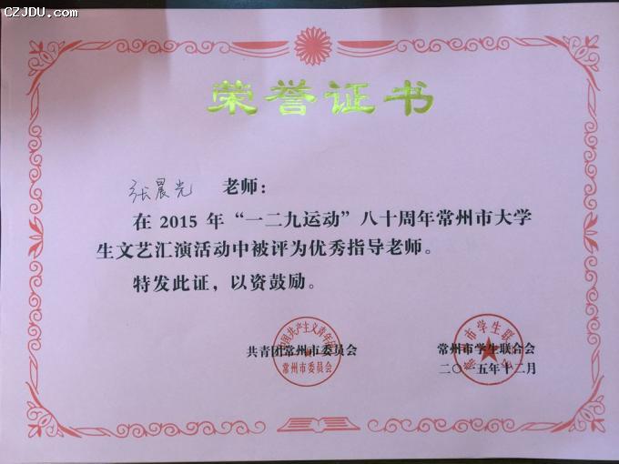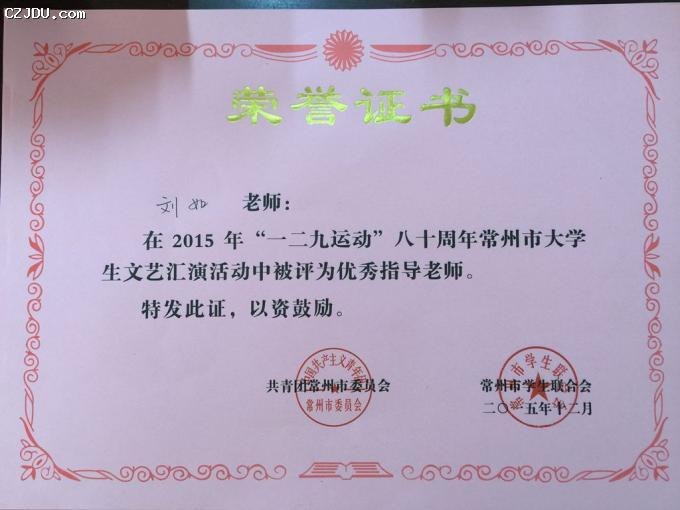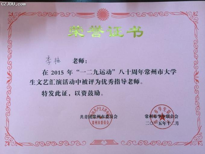 另外,在剛剛結(jié)束“弘愛國情懷,揚(yáng)青春夢想”紀(jì)念一二·運動八十周年常州市大學(xué)生文藝匯演中,我院的民族舞蹈“彩云之南”被評選為常州市大學(xué)生文藝匯演優(yōu)秀節(jié)目,我院五名老師被評為優(yōu)秀指導(dǎo)老師,他們分別為:學(xué)工處處長劉如、學(xué)工處副處長季艷、團(tuán)委書記過林燕、經(jīng)管系團(tuán)總支書記郭燕、藝術(shù)系團(tuán)總支書記張晨光。