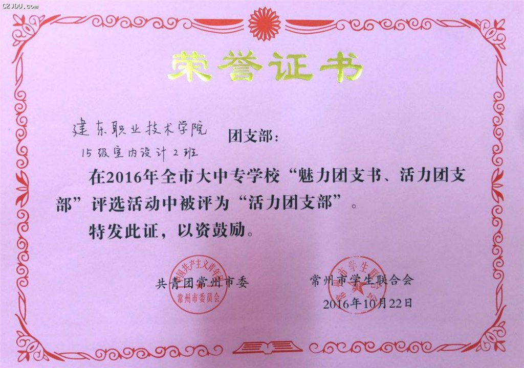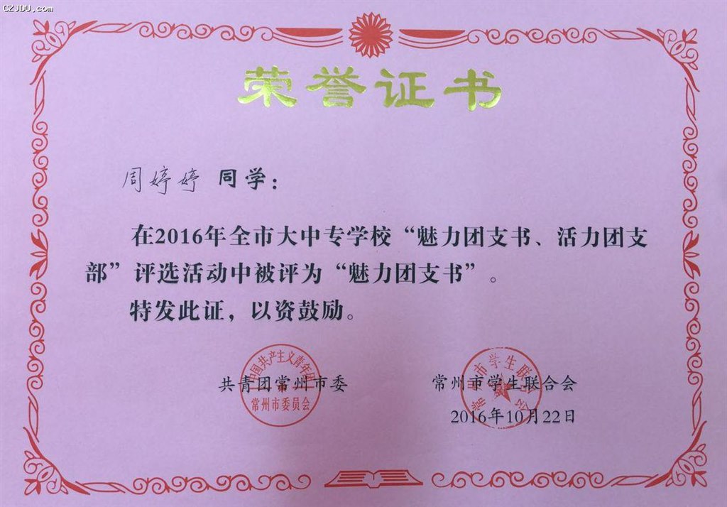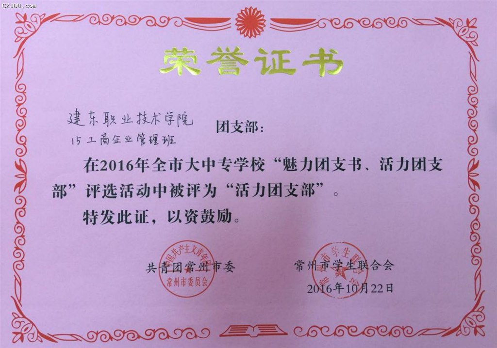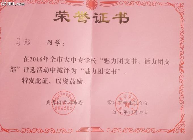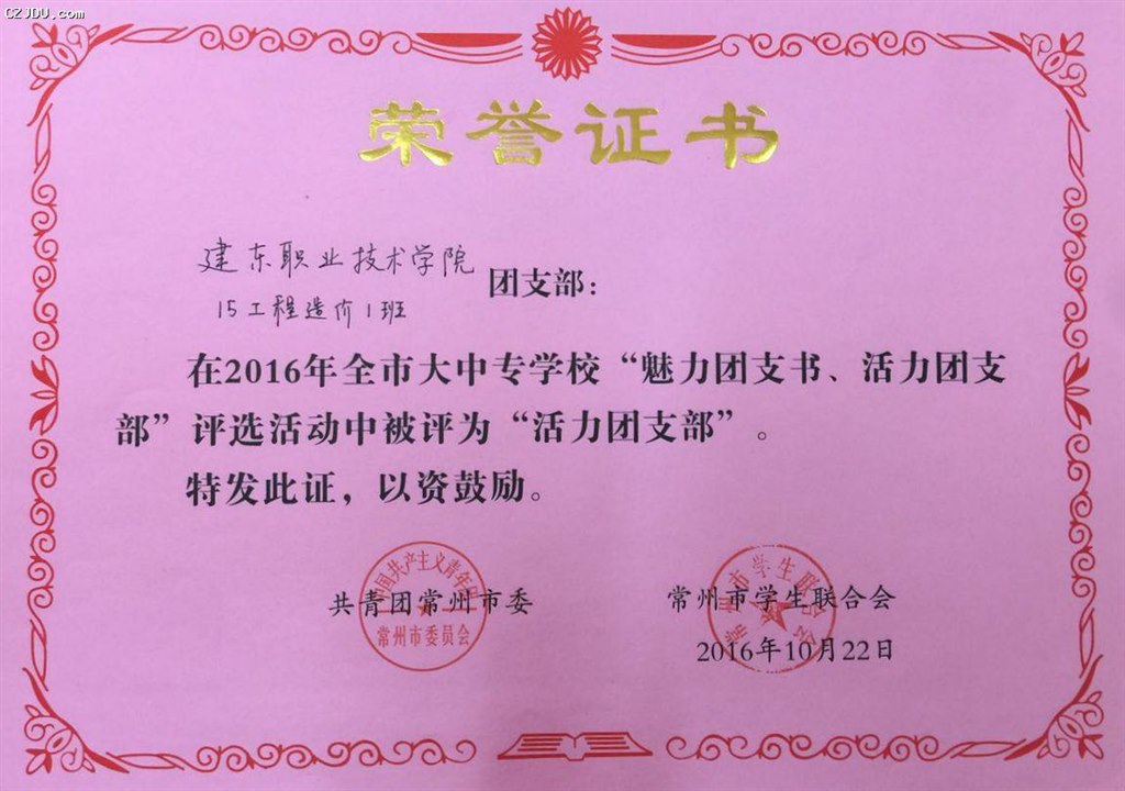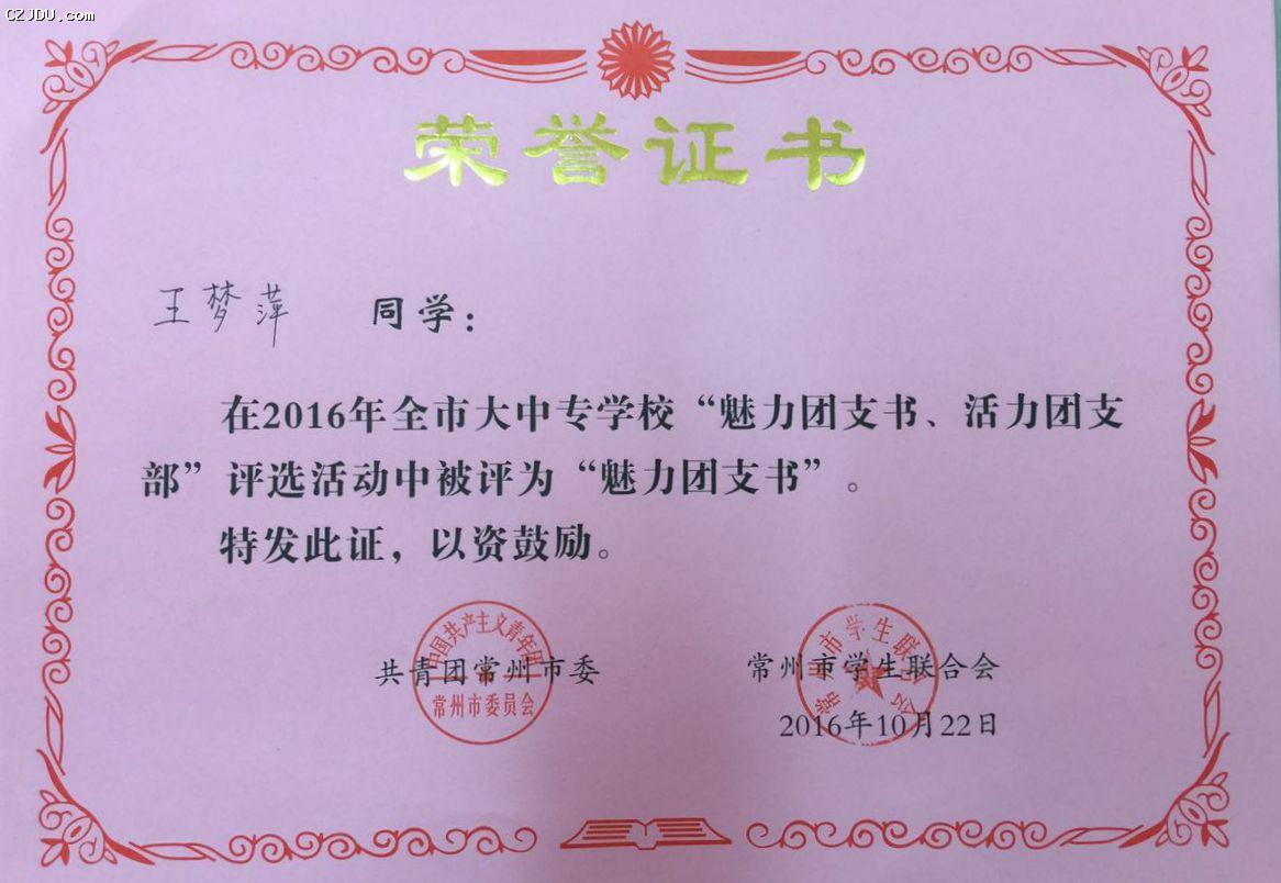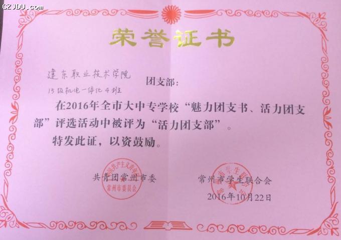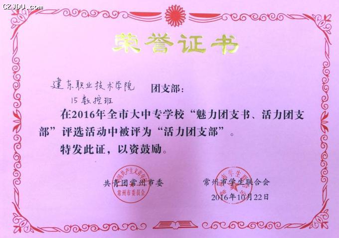 喜報:我院優(yōu)秀學(xué)生、團支部榮獲2016年度常州市大中專學(xué)?!镑攘F支書”“活力團支部”榮譽稱號