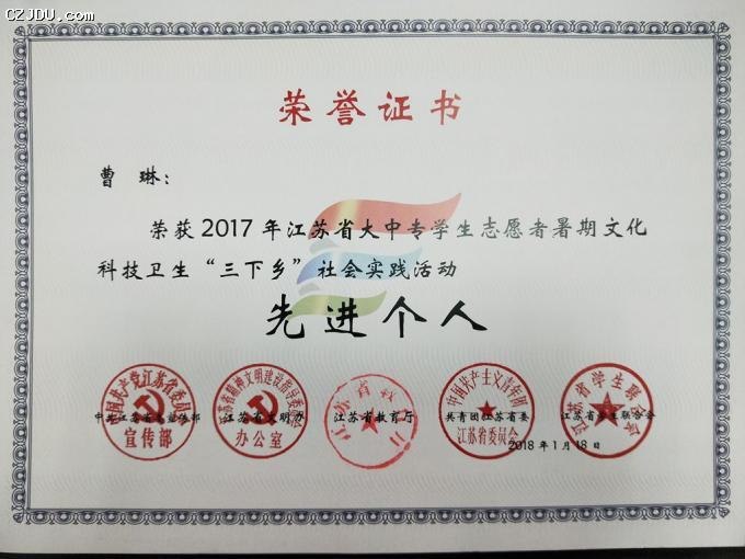 近期,江蘇省委宣傳部、省文明辦、省教育廳、團省委、省學聯(lián)通報表揚了2017年江蘇省大中專學生志愿者暑期文化科技衛(wèi)生“三下鄉(xiāng)”社會實踐活動優(yōu)秀團隊、先進工作者和先進個人。我院青年志愿者協(xié)會的“筑夢西倉,振翅翱翔”志愿者項目榮獲優(yōu)秀團隊榮譽稱號。團委書記過林燕榮獲2017年江蘇省大中專學生志愿者暑期“三下鄉(xiāng)”社會實踐活動先進工作者榮譽稱號。15級商務英語班學生曹琳榮獲2017年江蘇省大中專學生志愿者暑期“三下鄉(xiāng)”社會實踐活動先進個人榮譽稱號。