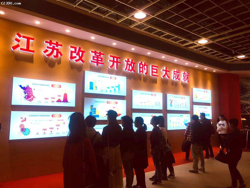 本次圖片展分 “序廳”、“歷史跨越”、“滄桑巨變”、“美好生活”和“結語”等5個部分共21個單元。另設有VR虛擬現(xiàn)實視頻和AR增強現(xiàn)實體驗區(qū),共展出圖片881幅(其中老照片302幅)、圖表67幅、城市形象宣傳片13部、VR視頻一部、微視頻4部。展廳入口處設計如同一個時光隧道,兩邊陳設了13組江蘇各個設區(qū)市發(fā)展變化的對比照片,全都是“一個角度看變化”,選取城市中最具有代表性的某個地點,由該地的變化管窺整座城市的滄海桑田。