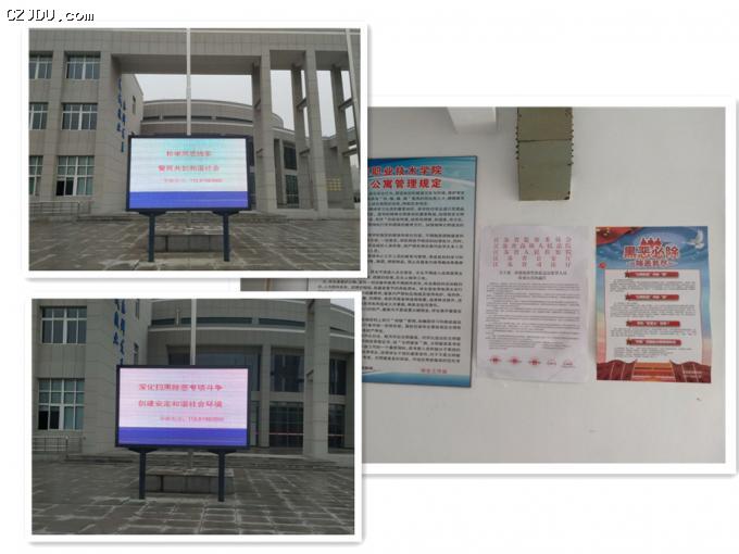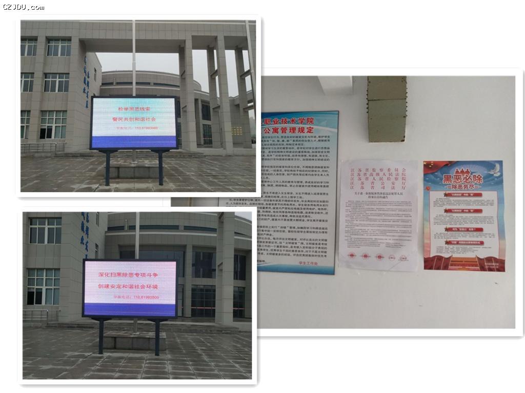 根據(jù)常州市公安局的總體部署,學院舉辦了“掃黑除惡”專題宣傳活動。通過在校園顯要位置懸掛橫幅、張貼“掃黑除惡”宣傳海報營造“黑惡必除,除惡務盡”的宣傳氛圍,通過電子顯示屏滾動播放標語、校園網(wǎng)絡、主題班會等宣傳方式讓廣大師生員工更多了解“掃黑除惡”專項斗爭的重要意義。