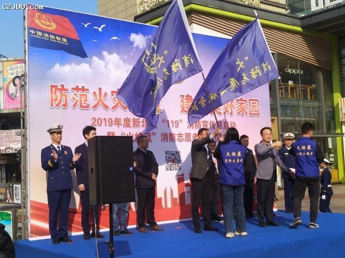與會(huì)領(lǐng)導(dǎo)為“火焰藍(lán)”消防志愿者授旗